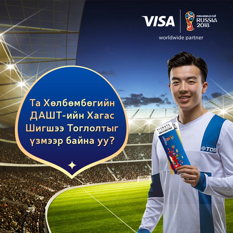 ХХБанкны харилцагч бүрд олгогдсон 6 орон бүхий урамшууллын кодоо ашиглан Та бусдад Visa карт санал болгон захиалуулсанаар Хөлбөмбөгийн ДАШТ-ийн Хагас шигшээ тоглолтыг үзэх урамшууллын эрх авах боломжтой боллоо. Та өөрийн урамшууллын кодыг хэдэн ч хүнд өгч Visa карт захиалуулж болох ба урамшууллын кодоор захиалсан карт бүрт эрх үүснэ. Урамшууллын код буюу промо кодоо TDB Online аппликейшн болон www.ebank.mn сайтаар нэвтрэн урамшуулал цэснээс харж, бусдад санал болгоорой.