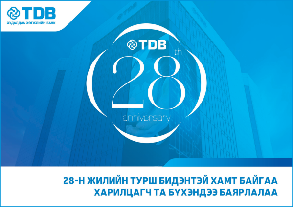 28-н жилийн турш ХӨГЖИЛ ДЭВШИЛД хамтдаа тэмүүлсэн Хүндэт харилцагчид, Бизнесийн итгэлт түншүүд, Банк санхүүгийн салбарт мөр зэрэгцэн хөдөлмөрлөж яваа мэргэжил нэгт банкирууд мөн банкныхаа амин чухал эд, эс нь болсон үе үеийн TDB-чүүд Та бүхэндээ ойн баярын мэнд дэвшүүлье.