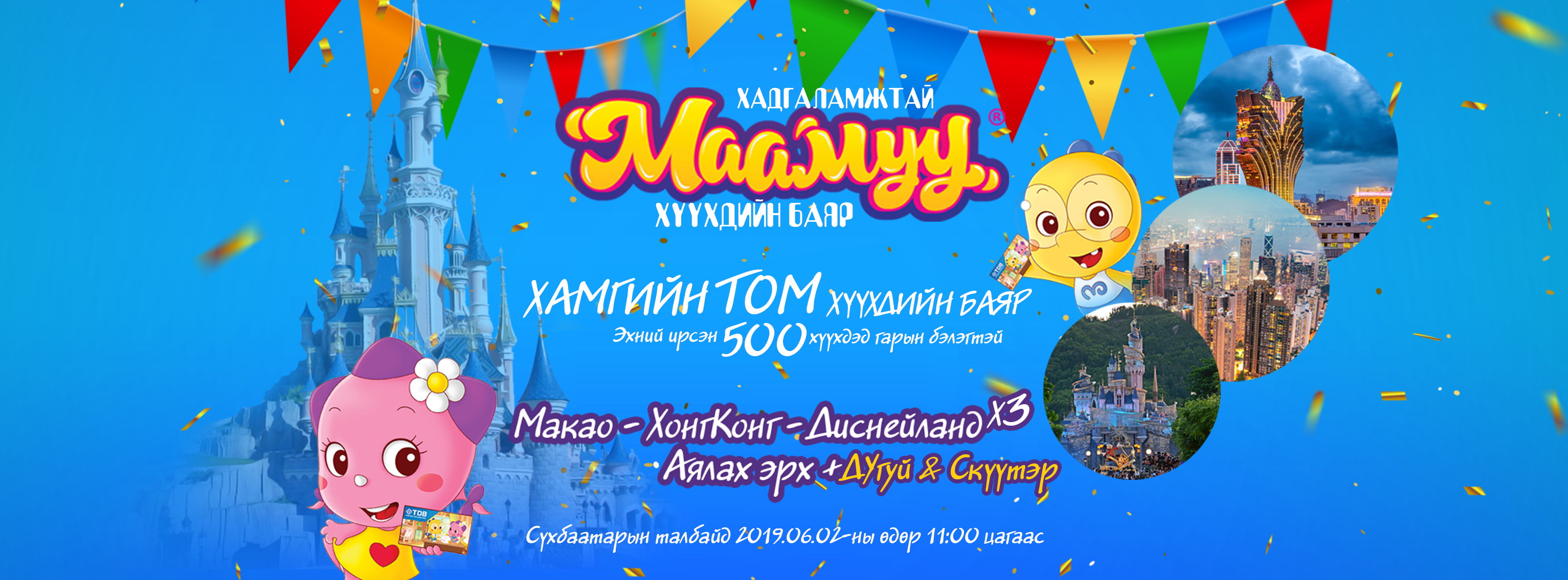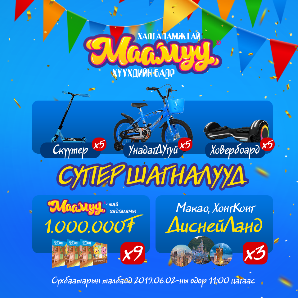 Худалдаа, хөгжлийн банкнаас Олон улсын хүүхдийн эрхийг хамгаалах өдрийг тохиолдуулан энэ оны хамгийн ТОМ, хамгийн олон гэнэтийн БЭЛЭГТЭЙ, супер СУГАЛААТАЙ 18 хүртэлх насны бүх хүүхдүүдийг баярлуулах “ХАДГАЛАМЖТАЙ МААМУУ” арга хэмжээг 6-р сарын 02-ны өдөр Сүхбаатарын талбайд зохион байгуулахаар бэлтгэл ажилдаа ороод байна.