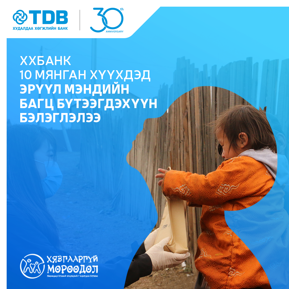 Энэ хүнд цаг үед Худалдаа, хөгжлийн банк хүүхдэд чиглэсэн “Хязгааргүй Мөрөөдөл” төслийнхөө хүрээнд гэртээ хөл хорионд байгаа зорилтот бүлгийн 10 мянган хүүхдийг халдварт өвчнөөс урьдчилан сэргийлэх, эрсдэл багатайгаар даван туулахад нь тусламж үзүүлэх зорилгоор 100 сая төгрөгийн үнийн дүн бүхий халдварын эсрэг хүүхдэд зориулсан эрүүл мэндийн багц бүтээгдэхүүн бэлэглэх ажлыг санаачлан хэрэгжүүллээ.