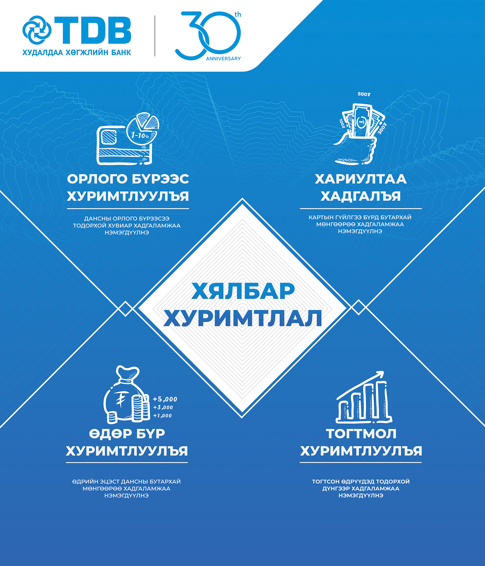 Тус аяны хүрээнд иргэдэд санхүүгийн дарамтгүйгээр хуримтлалаа нэмэгдүүлэх боломжтой ХЯЛБАР ХУРИМТЛАЛЫН үйлчилгээг зах зээлд нэвтрүүллээ. Уг үйлчилгээ нь харилцагч данснаасаа зарлага гаргах болон орлого нэмэх бүртээ тодорхой хэмжээний үнийн дүнг автоматаар, хадгаламж руугаа шимтгэлгүй шилжүүлэх хялбар сонголтуудтай бүтээгдэхүүн юм.
