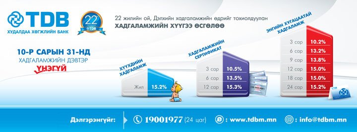 Эрхэм харилцагч Та бүхэн Дэлхийн хадгаламжийн өдрөөр манай банкны бүх салбар, тооцооны төвүүдэд хадгаламжийн дэвтрээ үнэгүй нээлгэхийг урьж байна.