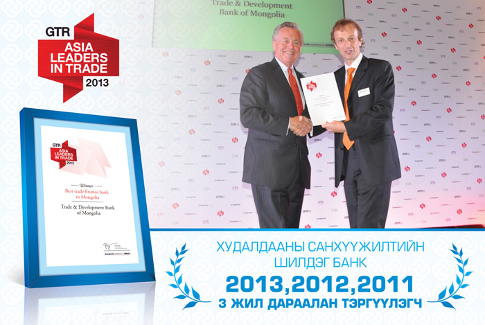 Олон улсад танигдсан Худалдаа, хөгжлийн банкийг дэлхий дахинд үнэлсэн томоохон шагналууд үргэлжилсээр, “Монгол улсын худалдааны санхүүжилтийн шилдэг банк”-аар 3 жил дараалан шалгаруулж, 2013 оны шагналыг мөн хүртлээ.