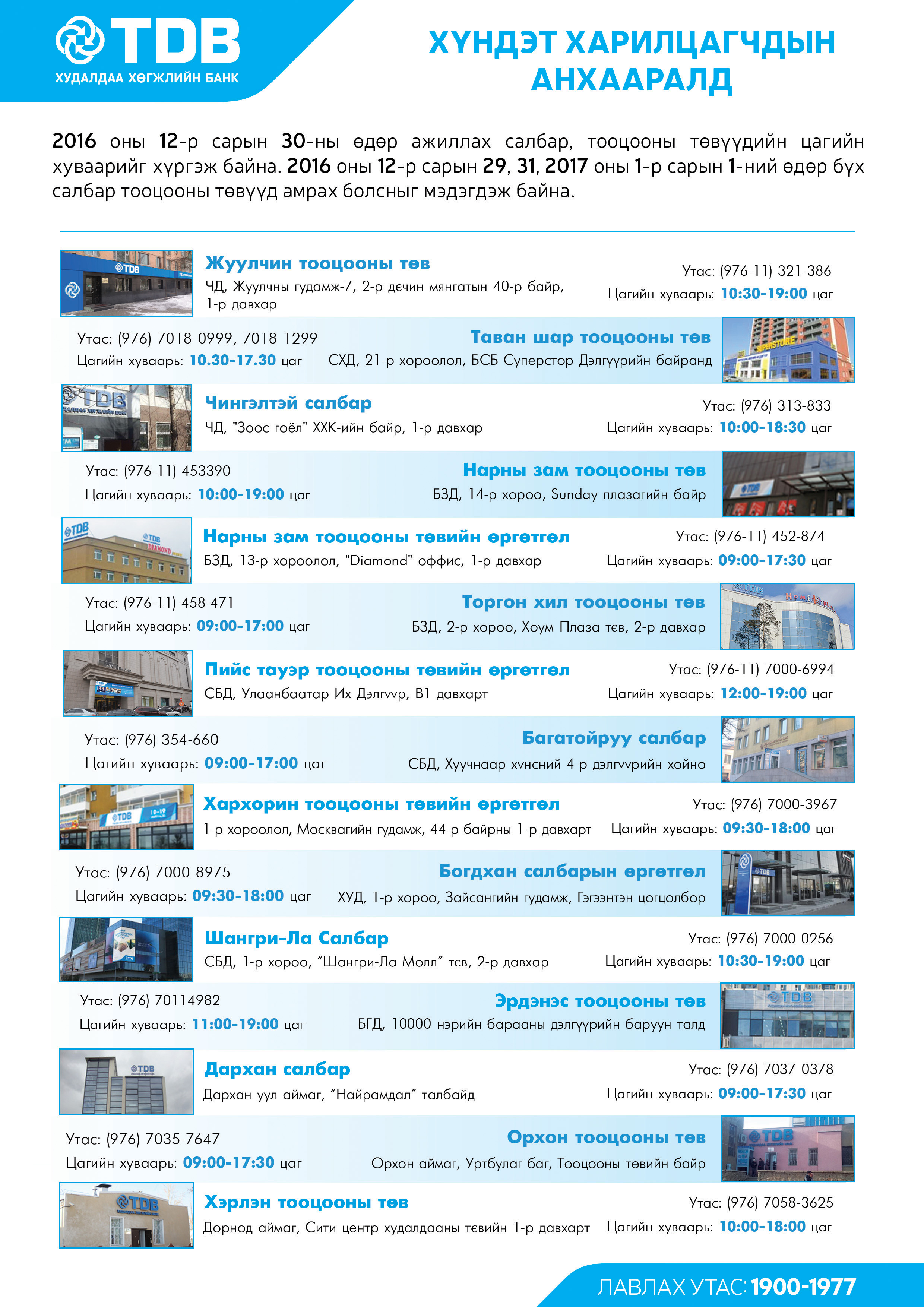 Хүндэт харилцагч Та бүхэнд баярын өдрүүдэд ажиллах цагийн хуваарийн мэдээллийг хүргэж байна.