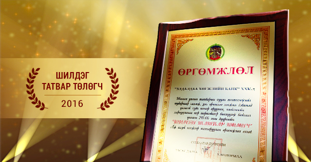 “Эх орныхоо хөгжлийг бүтээгч эрхэм татвар төлөгч танд баярлалаа” уриан дор зохион байгуулагдаж буй Нийслэлийн Татвар Төлөгчдийн өдрийн хүрээнд Сүхбаатар дүүргийн татварын хэлтсээс ХХБанкыг Монгол улсын үндсэн хуулиар хүлээсэн үүргээ нэр төртэй биелүүлэн, эх орныхоо хөгжил дэвшилд үнэтэй хувь нэмэр оруулж буйг үнэлэн 2016 оны “Шилдэг Татвар Төлөгч”-өөр шалгарууллаа.