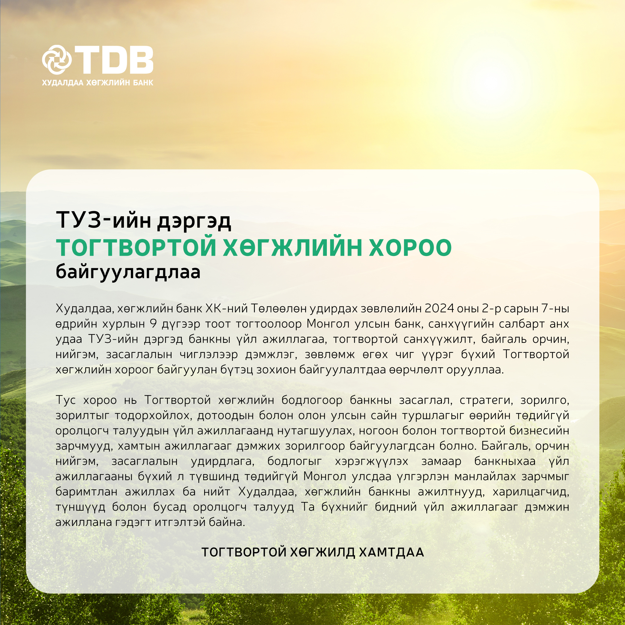 Since last July, Mongolia has fully complied with the 40 recommendations of the Financial Action Task Force (FATF) and further enhanced its evaluation. As a result, the continuous international remittance challenge is now being eased. In this regard, I spoke with Mr. Banzragch.O, the First Deputy CEO of TDB, which is the leading commercial bank in the international banking market.