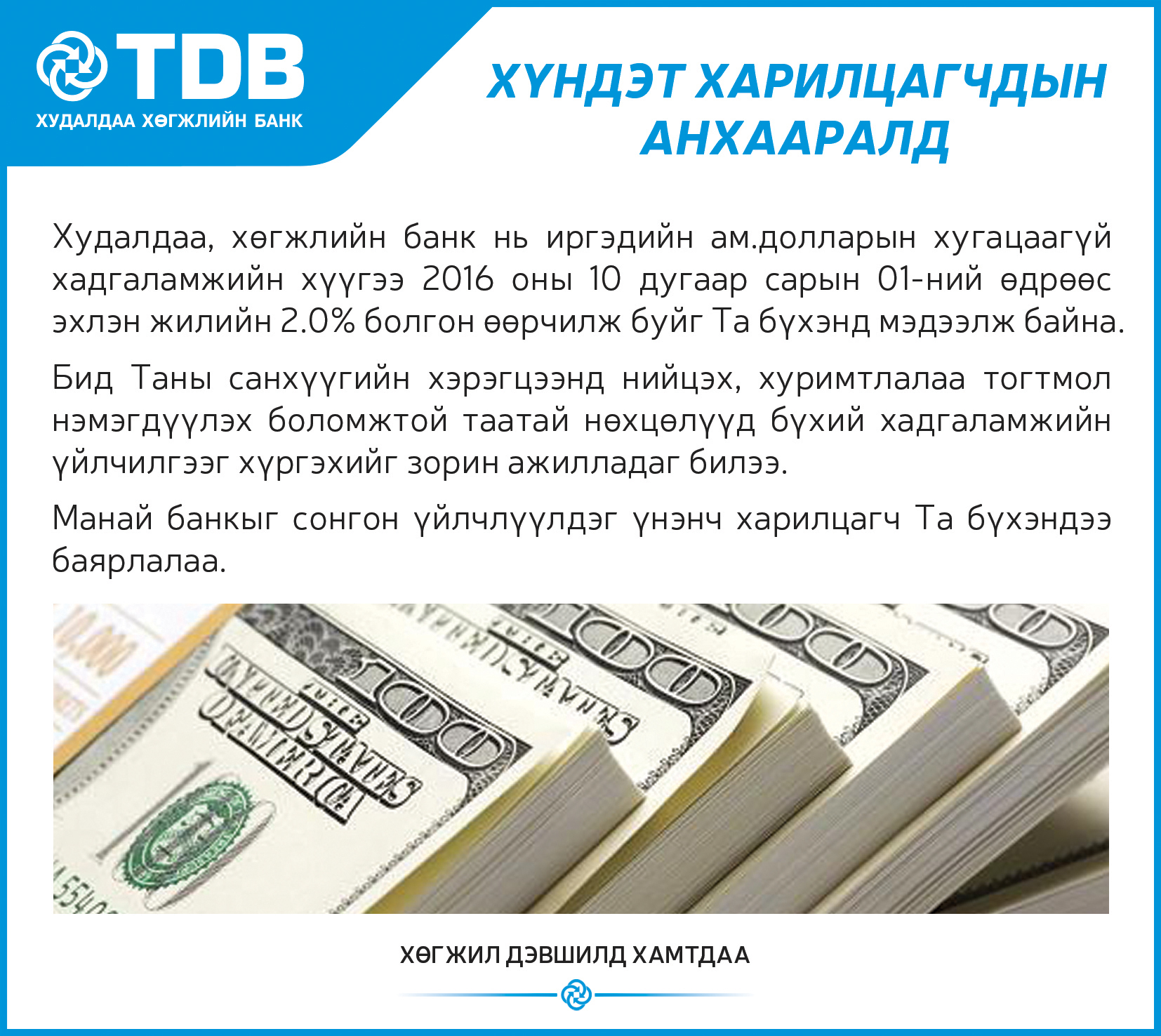 Бид банкныхаа 26 жилийн ойг угтан Монгол улсын тогтвортой санхүүжилт (ТоС)-ийн хөтөлбөрийн хүрээнд “Туул голын сав газрыг цэв